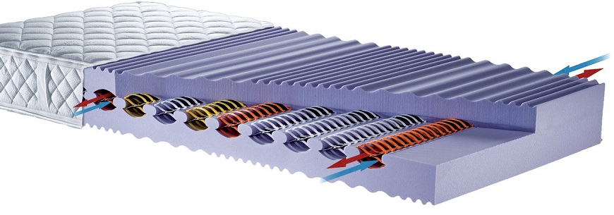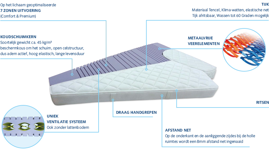 Het matras is gemaakt van koudschuim met een open structuur, ademt, is hoog elastisch en heeft een lange levensduur. De kern van het matras bestaat uit een unieke concept waarbij de horizontale veerelementen ook het ventileren van het matras mogelijk maken. Bij iedere beweging op een Flexima® matras wordt door de holle ruimtes van de veerelementen de warme en vochtige lucht uit de matraskern gepompt. Tegelijkertijd wordt er verse schone lucht naar binnen gezogen. Hierdoor is onderbeluchting of een lattenbodem niet nodig. Aan de onderkant en zijkanten wordt een 8mm dikke netting aangebracht wat het ventilerende vermogen verhoogd.